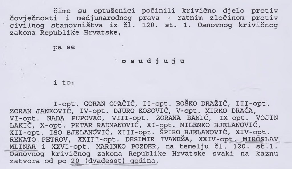 „U odnosu na ove optuženike, obzirom na težinu počinjenih djela izabrana je najstrožija kazna zatvora u trajanju od 20 (dvadeset) godina, kao najbliži zakonski ekvivalent njihovim kriminalnim činima.“