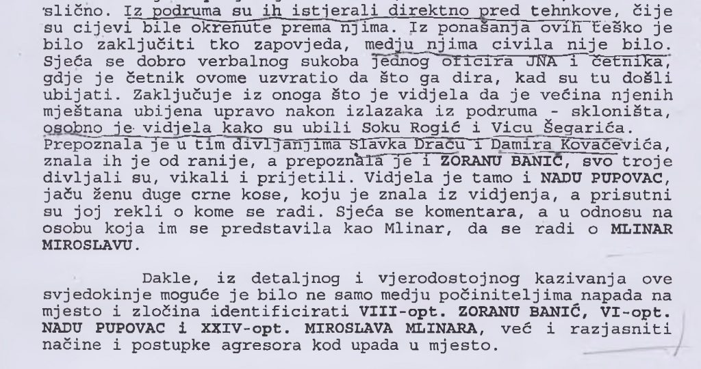 „Pokraj dvorišta kuće gdje joj je ubijen svekar vidjela je ZORANU BANIĆ, koja je bila medicinska sestra u Ambulanti u Zemuniku Donjem, takodjer u šarenoj uniformi i automatom, sa još dvije ženske osobe isto obučene i naoružane, kasnije je saznala da je jedna od njih NADA PUPOVAC.