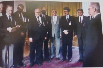 24. prosinca 1991. na Badnjak. Prijam članova Kriznog stožera Vojne bolnice Zagreb kod predsjednika Republike dr. Franje Tuđmana S lijeva na desno: dr. Đuro Vranešić, doc. Dr. Ivo Vučković (ima pozdravni govor), dr. Branimir Modrić, dr. Stjepan Kučić, ing. Jasenko Šaić, Ivan Klasić, med. tehn. (u svjetlom odijelu) ing. Krunoslav Antoliš, dr. Drago Kozjak, i vidi se predsjednik dr. Franjo Tuđman okrenut djelatnicima bolnice
