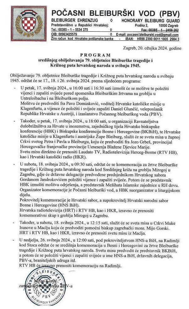 Obilježavanje 79. obljetnice Bleiburške tragedije i Križnog puta hrvatskog naroda u svibnju 1945. održat će se 17., 18. i 26. svibnja 2024. prema sljedećem programu: