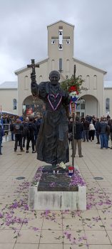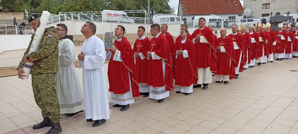 Na trgu ispred crkve Hrvatskih mučenika vidimo svetoga papu Ivana Pavla II., velikog prijatelja hrvatskog naroda, s križem u ruci, koji je potaknuo da se ne zaborave žrtve proteklih ratova. Križ je replika „Zlatnoga križa krbavskih biskupa“. Tako ova crkva postaje još znakovitija a današnji blagdan Uzvišenja Svetoga Križa još znakovitiji za nas i za naš narod koji danas obilježava Dan hrvatskih mučenika. U sjećanja nam naviru brojna braća i sestre koja su nestala na raznim planinama i padinama, dolinama i poljima, od ovoga Krbavskoga 1493. godine do onoga Bleiburškoga 1945., čija su tijela završavala u raznim rovovima i jarugama, kanalima i jamama, od Vukovara do Dubrovnika, preko Zrina i Škabrnje. Prisjetimo se da se ni na ove prostore, nakon što je protjerano hrvatsko katoličko stanovništvo u prosincu 1942., nije smjelo vratiti na svoja ognjišta. O tomu se nije smjelo ni pričati pa niti spomenuti. Brojna su takva mjesta širom domovine pa i šire u susjednim zemljama gdje su Hrvati živjeli i kuda su hodili. Bogu smo zahvalni što smo, unatoč svim progonstvima, pogibeljima, prijetnjama i nepravdama još uvijek tu. Pogotovo kada promotrimo grubu kampanju protiv Crkve i kršćanske vjere.