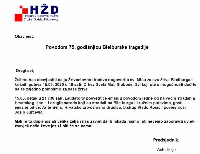 Obavijest povodom 75. godišnjice Bleiburške tragedije