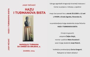 Pozivamo na predstavljanje knjige akademika Josipa Pečarića "HAZU I TUĐMANOVA BISTA" koje će održati u utorak 25.6.2024. u 11 sati u prostorijama HVIDR-e Grada Zagreba, Slovenska 21.O knjizi će govoriti: Željko Olujić, odvjetnik Mato Kovačević, novinar i publicist akademik Josip Pečarić, autor knjige