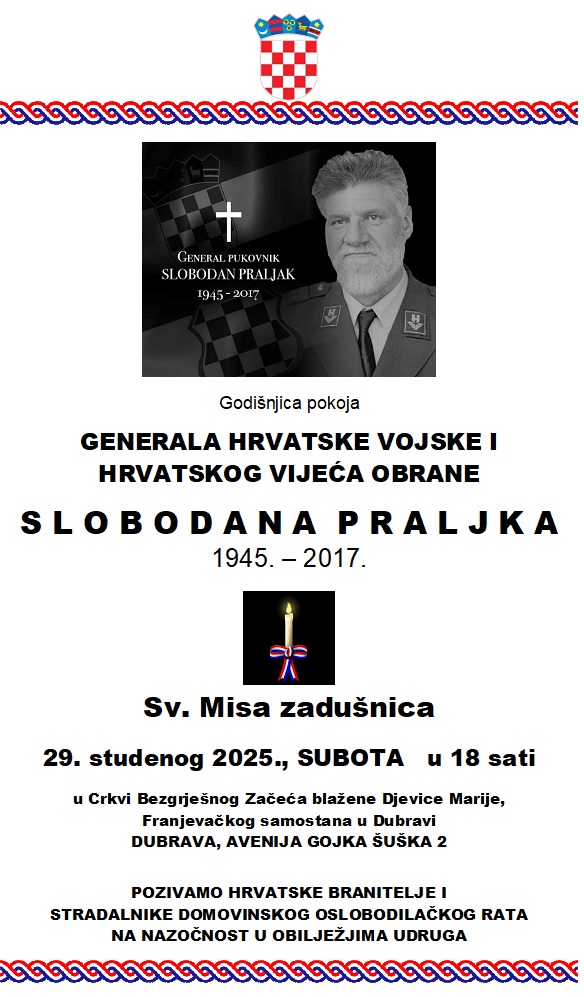 Sveta misa zadušnica za generala Slobodana Praljka 29. studenoga 2025. u Dubravi